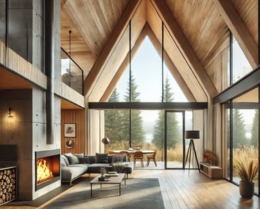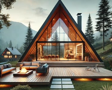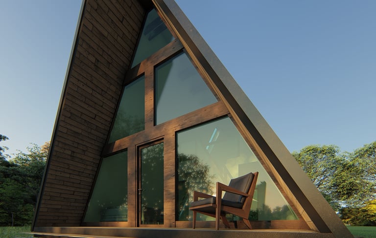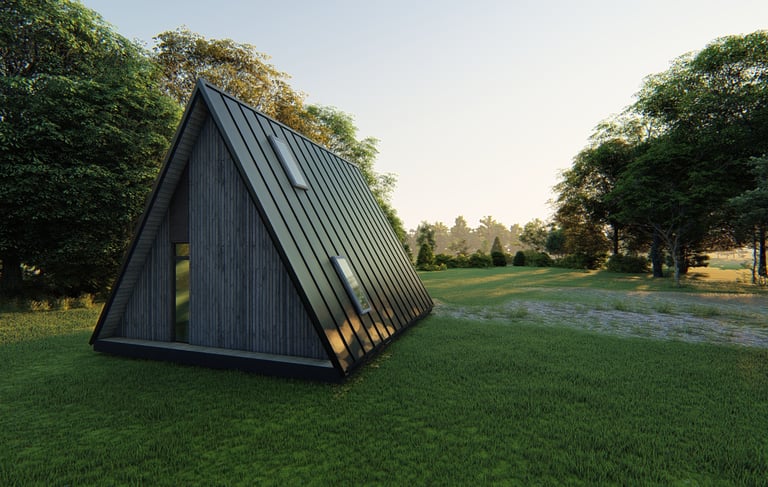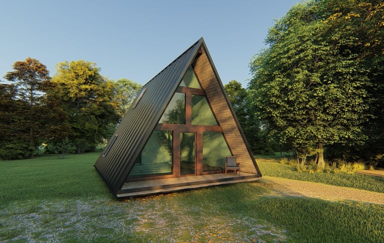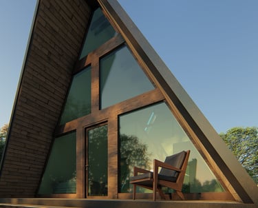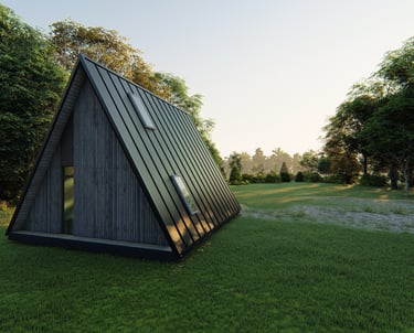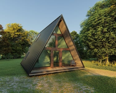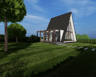 Refugium A-Frame este o cabană modernă parter, construită integral din lemn, cu un design minimalist și funcțional. Cu o fațadă principală vitrată, aceasta oferă o conexiune directă cu natura și lumină naturală din abundență.