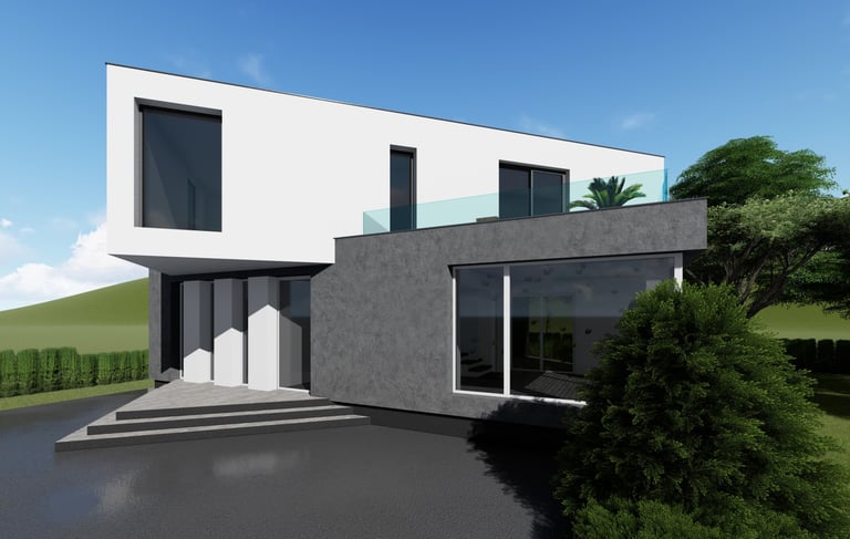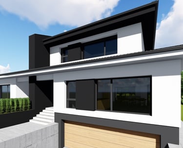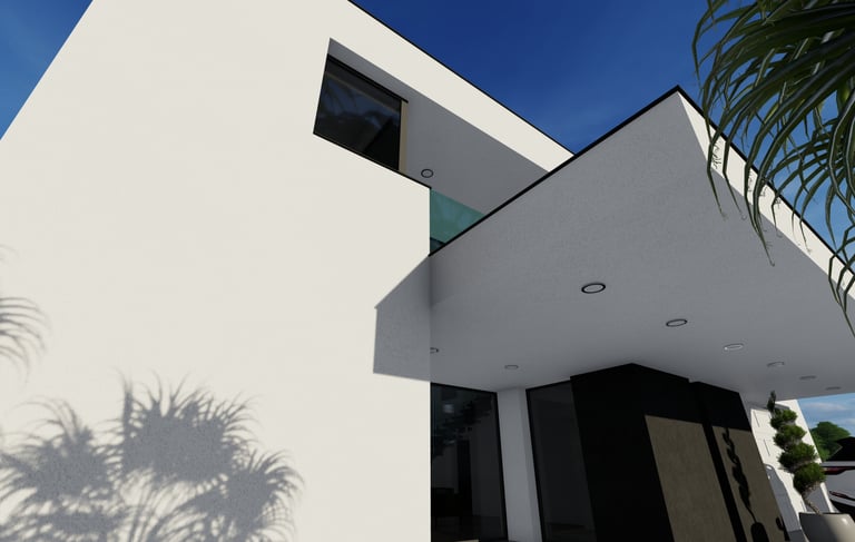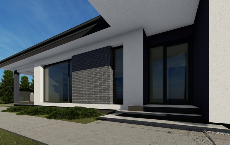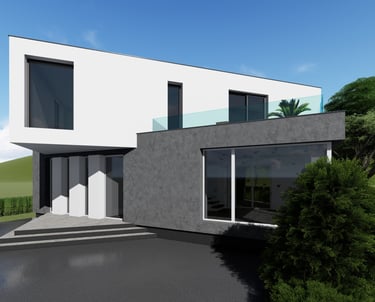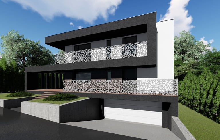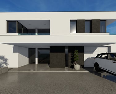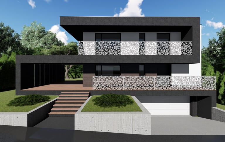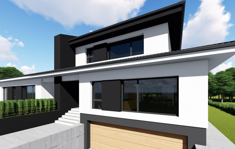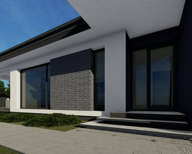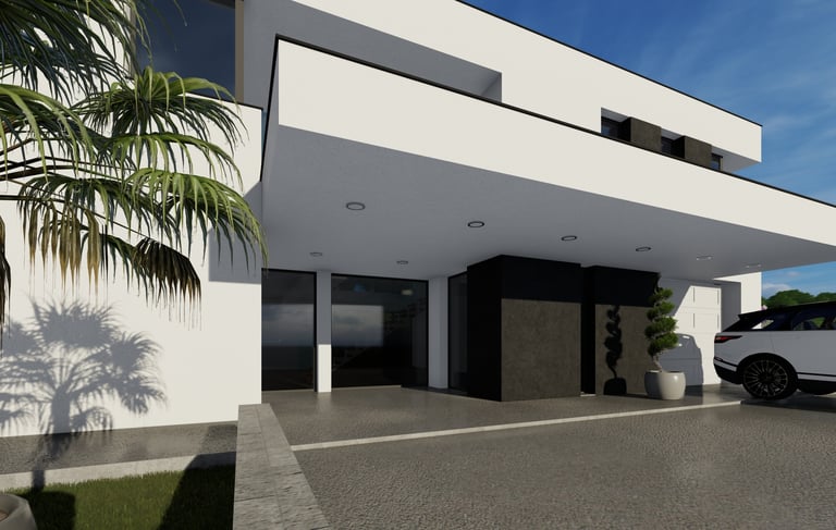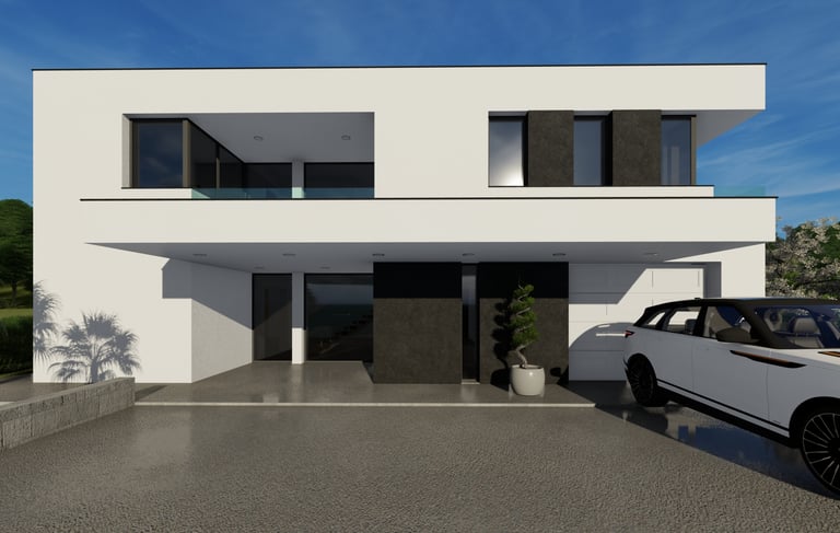 VeroDesign este o locuință impresionantă D+P+E, construită din cărămidă și beton, ce redefinește eleganța contemporană printr-un design futurist. Liniile drepte și geometrice domină estetica exterioară și interioară, evidențiate de paleta rafinată de culori în alb și gri antracit.