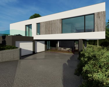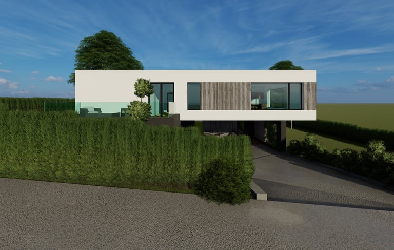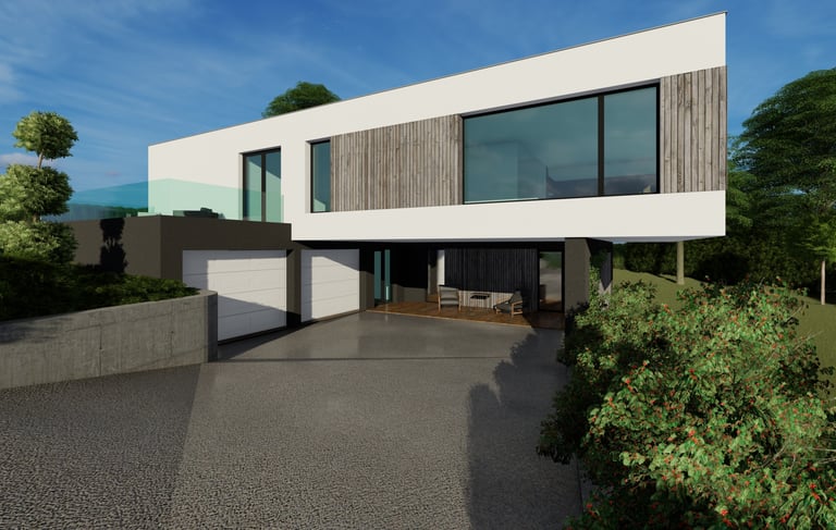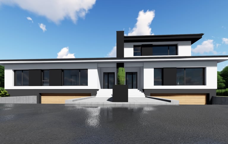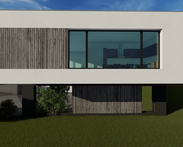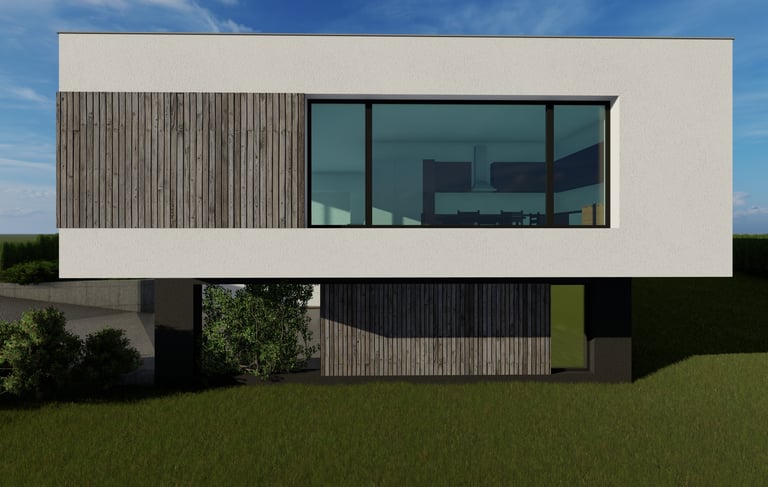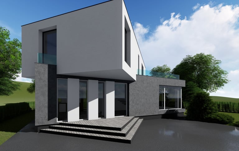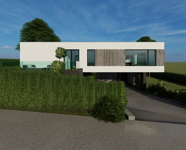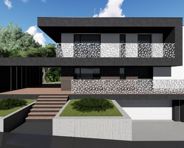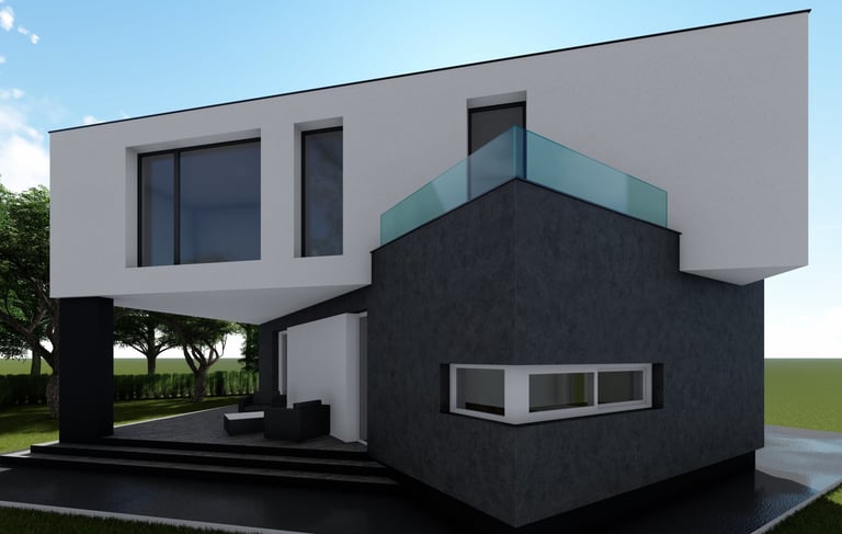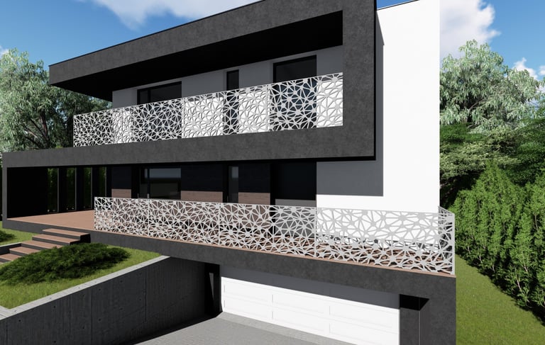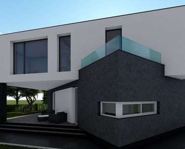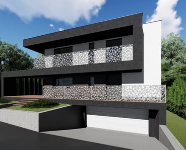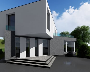 VeroDesign este o locuință impresionantă D+P+E, construită din cărămidă și beton, ce redefinește eleganța contemporană printr-un design futurist. Liniile drepte și geometrice domină estetica exterioară și interioară, evidențiate de paleta rafinată de culori în alb și gri antracit.