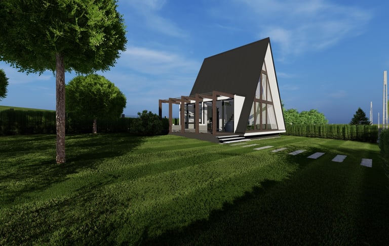 Descoperă farmecul unei locuințe moderne, proiectată în stil A-frame, cu linii arhitecturale elegante și spații luminoase. Casa are o suprafață construită de 120 mp și 92 mp utili, gândită pentru a oferi confort și funcționalitate atât pentru locuit permanent, cât și ca investiție pentru închiriere.